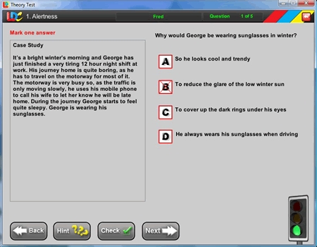 - 14 properly balanced pre-set simulated Theory Tests based on our extensive experience (as one of the largest national driving schools in the UK) of the most commonly occurring test questions all under realistic exam conditions.